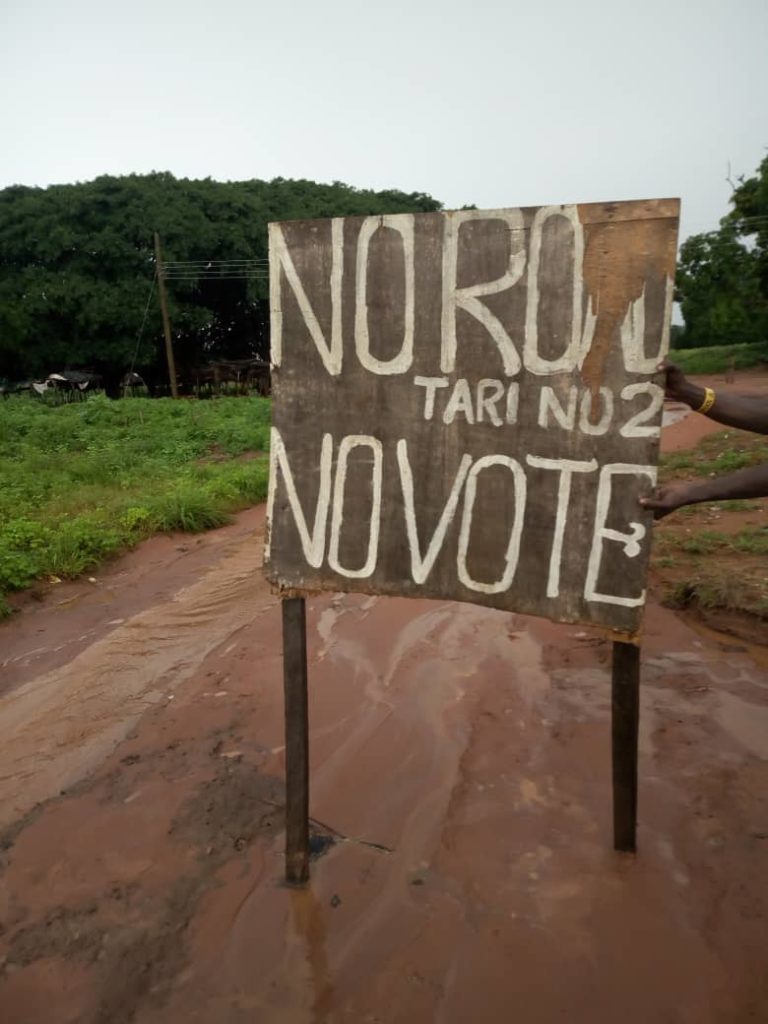 Residents of the community had mounted a billboard with the inscription ”No road No Vote” right in the middle of the road before one gets to the community.