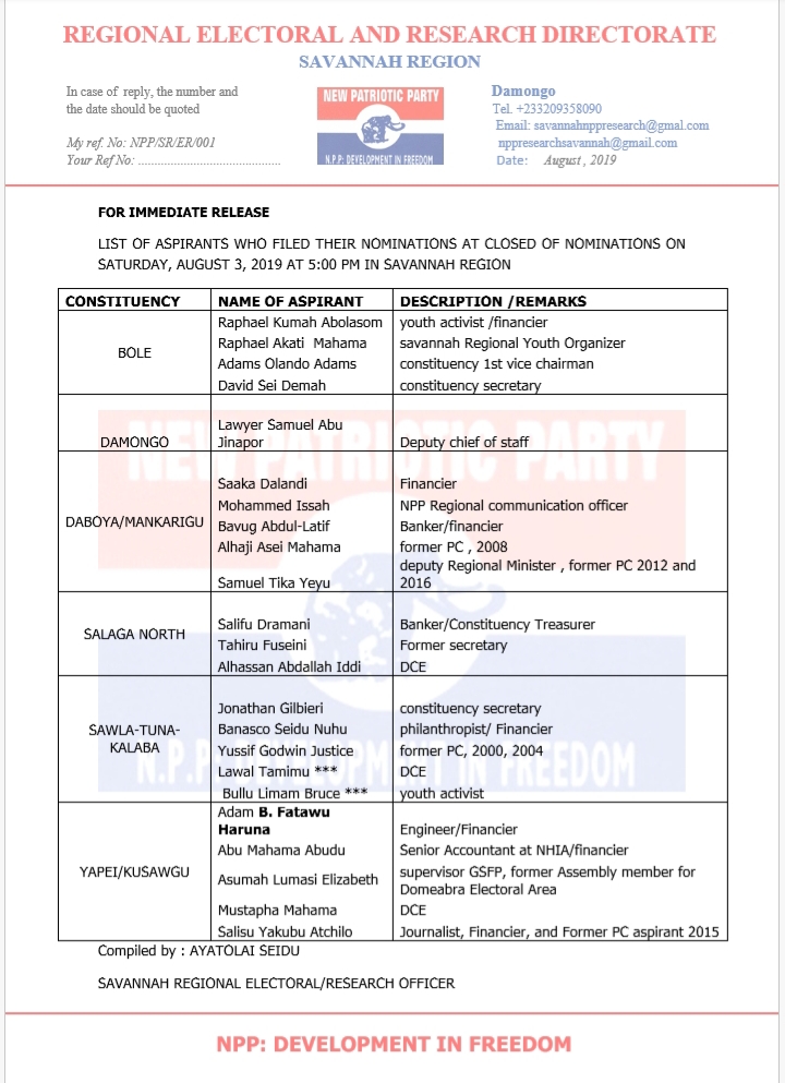 The Savannah Regional Research and Election Officer Mr Ayatolai Seidu released the list at the close of nominations on Saturday 3rd August, 2019 at 5:00pm.