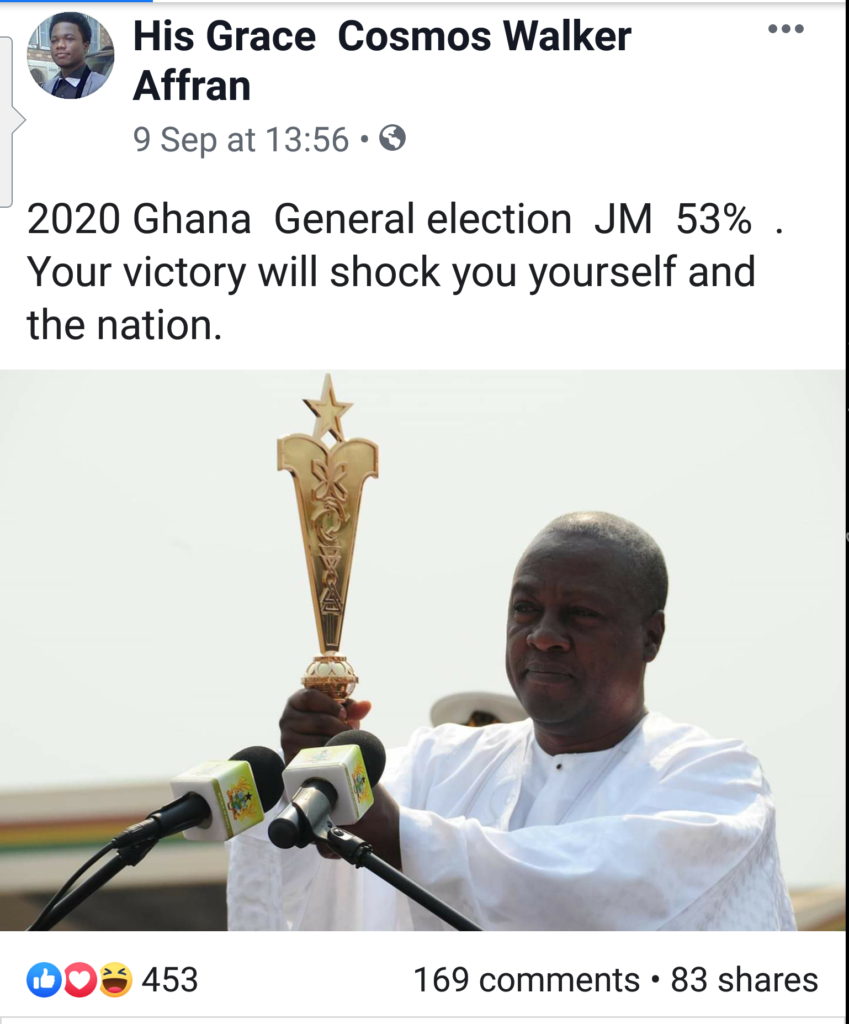 Prophet Cosmos Walker Affran in a Facebook post predicted that Mahama will win by 53% in the 2020 Presidential and Parliamentary elections.