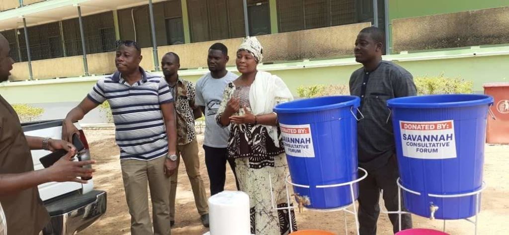 The items bought and donated by the Savannah Consultative Forum include 14 Veronica buckets with metal stands, 45 Personal Protective Equipments (PPE), 70 liquid soaps, 70 paper towels, 7,000 pairs of hand gloves to the various Municipal and District Assemblies on Thursday 2nd April 2020. The Chief Executives of the Municipalities and Districts in the Savannah Region received the items from a team led by Jerry A. Yahaya , a former DCE of Bole District and a lecturer at the University of Development Studies School of Medicine and Health Sciences, and Mr Yahaya Alhassan who works at the Tamale Teaching Hospital as a Nutritionist and who has been formerly trained on COVID 19 management.
