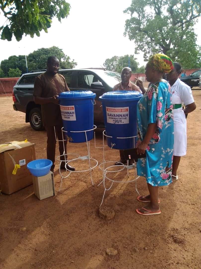 The items bought and donated by the Savannah Consultative Forum include 14 Veronica buckets with metal stands, 45 Personal Protective Equipments (PPE), 70 liquid soaps, 70 paper towels, 7,000 pairs of hand gloves to the various Municipal and District Assemblies on Thursday 2nd April 2020. The Chief Executives of the Municipalities and Districts in the Savannah Region received the items from a team led by Jerry A. Yahaya , a former DCE of Bole District and a lecturer at the University of Development Studies School of Medicine and Health Sciences, and Mr Yahaya Alhassan who works at the Tamale Teaching Hospital as a Nutritionist and who has been formerly trained on COVID 19 management.