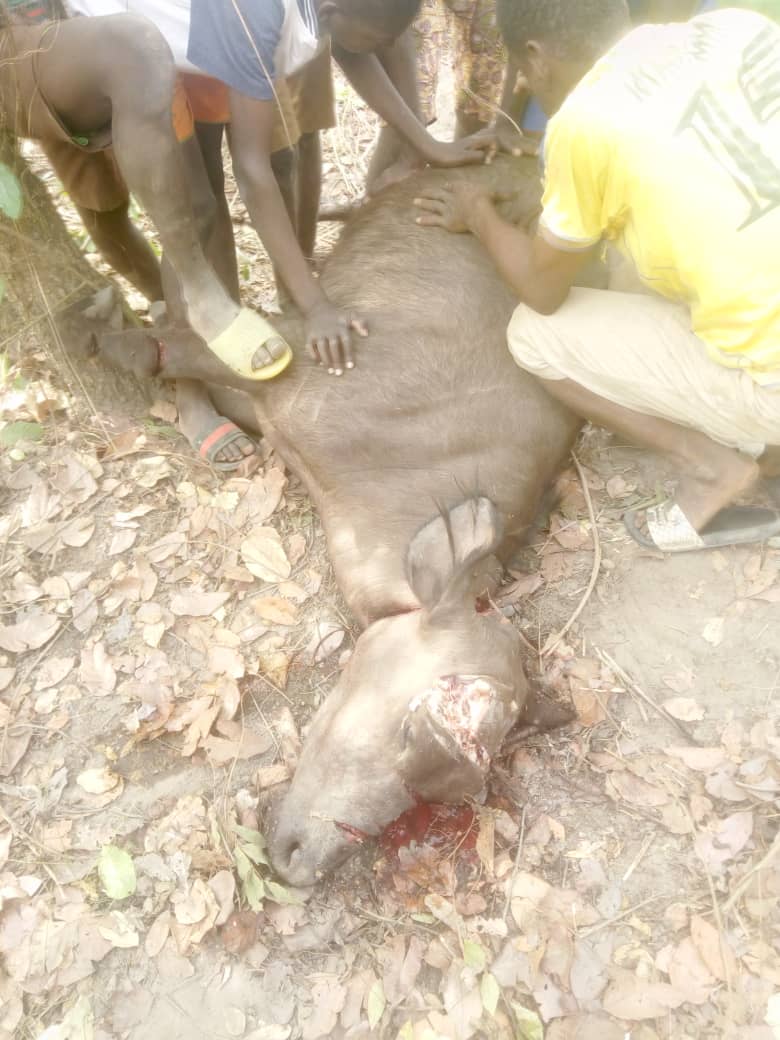 The farmers in the area went to plant yams in their farm and one of them with his dogs entered into the bush for hunting and met the buffalo. The hunting dogs of the farmer chased the buffalo whilst the farmer was wailed to send a distress call to his colleague farmers to come over and help him kill the animal.