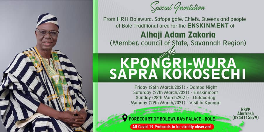 The Chieftaincy enskinment of Alhaji Adam Zakaria, an elected Member of Council of State of Ghana representating the Savannah Region as Kpongriwura Sapra Kokosechi of the Bole Traditional area would take place from Friday 26th March, to Sunday 28th March, 2021.