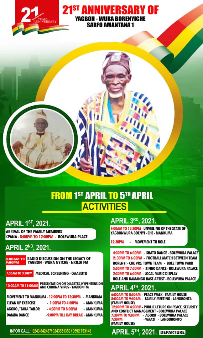 On 3rd April, 2021, the statue of Yagbonwura Safo Amantana Borenyinche will be unveiled at Mankuma after which other activities continue at Bole.