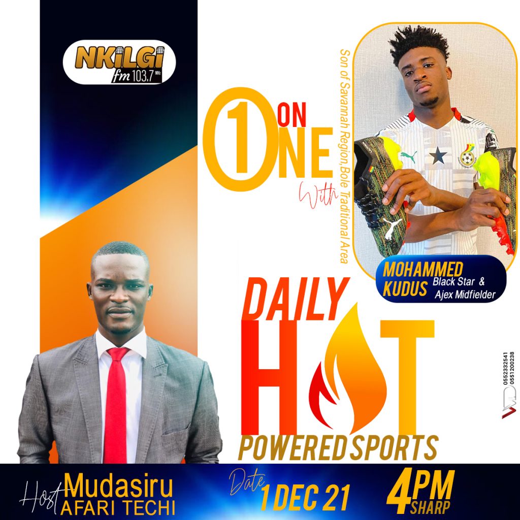 Ghana Black Stars and Ajax midfielder, Kudus Mohammed will be on Savannah Region’s best radio station, Nkilgi FM today 1st December, 2021.