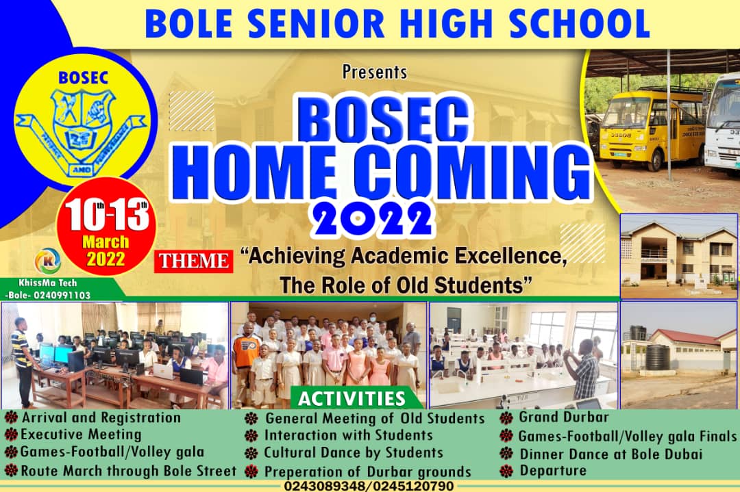 The Old students of Bole Senior High School (SHS) in consultation with the schools management have scheduled 10th to 13th March 2022 for the school homecoming programme under the theme; “Achieving Excellence, the role of Old students”.