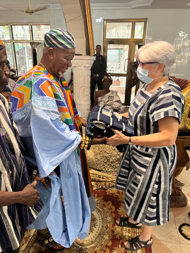 The Paramount Chief of the Buipe traditional area presented a Gonja cloth to ourgoing American Ambassador in appreciation of her love shown his traditional area and the Savannah Region.