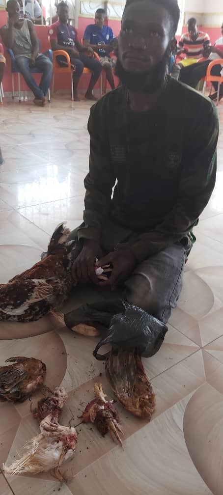 According to the youth, the tough man is suspected to be behind killing of fowls and severing their heads, wings and some parts of the fowl leaving the remaining part at the scene where the fowls are killed .