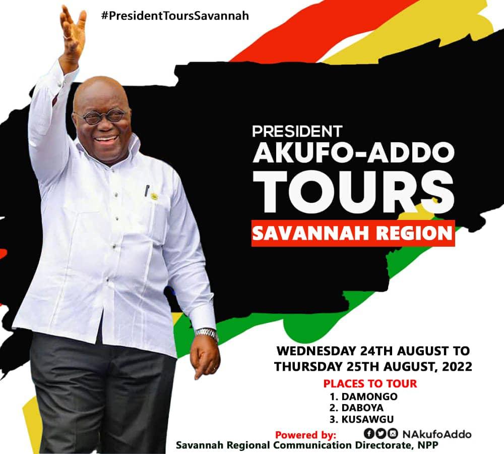 The Savannah Region NPP Communication officer said the final day of the President’s tour on Thursday, 25th August, 2022 will take him to Daboya to pay a courtesy call on the paramount chief of the Wasipe Traditional Area; Wasipewura Mumuni Kabasagya at 11:00 in Daboya, after which the President will inspect the Agenda 111 and Regional Health Directorate.