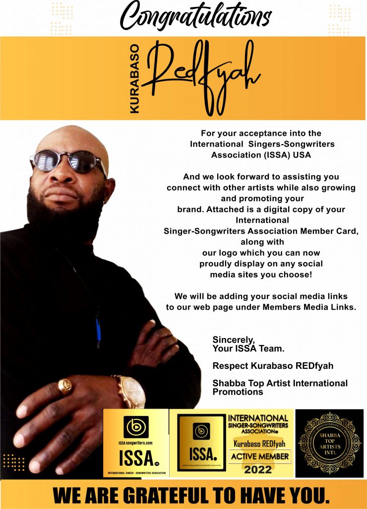 REDfyah, the Ghanaian super talented and multi-genre artiste, has been officially inducted into the multinational membership of ISSA [International Singers Songwriters Association], USA, and he’s been issued with a printable digital member card to authenticate his official membership.