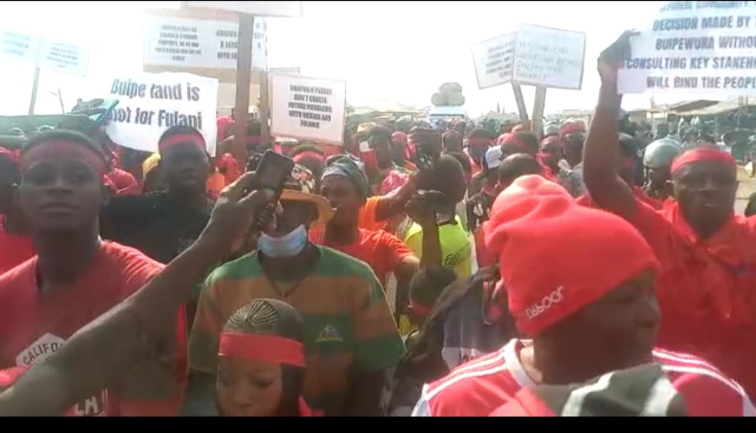 The demonstration by the youth was basically against the decision by the paramount Chief of Buipe traditional area, Buipewura Abdulai Jinapor (II) to allocate several hectors of land to Fulanis in the area and as well enskin one of them with the tittle; “Fulani Mande Chief”.