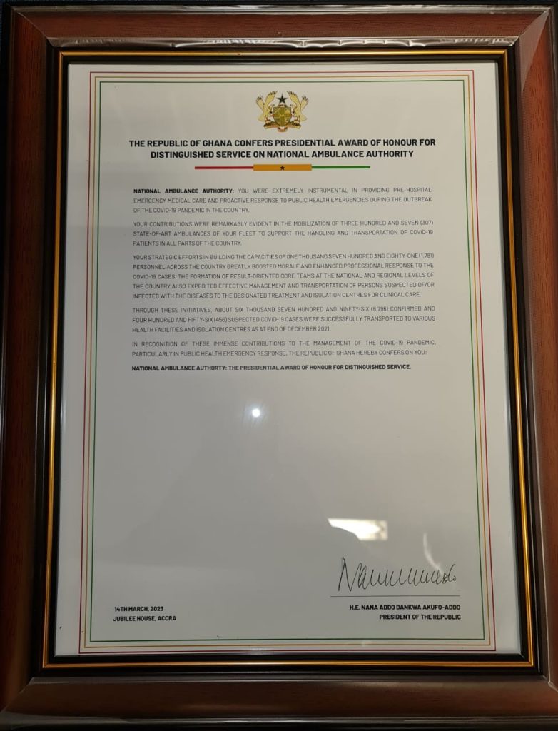 This is the full statement of the Presidential Award for the National Ambulance Authority:*The Republic of Ghana Confers Presidential Award of honour for distinguish service on National Ambulance Authority*National Ambulance Authority: You were extremely instrumental in Providing Pre-Hospital Emergency Medical care and proactive response to public health emergencies during the outbreak of the COVID-19 pandemic in the country.Your contribution so were remarkably evident in the mobilization of Three hundred and seven (307) State-Of-Art Ambulances of your fleet to support the handling and transportation of COVID-19 patients in all parts of the country. Your Strategic efforts in building the capacity of one thousand seven hundred and eighty one (1781) personnel across the country greatly boosted morale and enhanced professionals response to the COVID-19 cases.The formation of Result-Oriented Cure Teams at the National and Regional levels of the he country.Also, expedited effective management and transportation of persons suspected of/or infected with the disease to the designated treatment and isolation centers for clinical care.Through these initiatives about Six thousand and seven hundred and ninety six confirmed and Four hundred and fifty six suspected COVID-19 cases were successfully transported to various facilities and isolation centers.As at the end of December 2021in recognition of thes immense contribution to the management of the COVID-19 pandemic, particularly in public health and emergencies response, The Republic of Ghana hereby Confers on you National Ambulance Authority: The Presidential Award of honour for distinguished service.14th March, 2023Jubilee Hous,AccraHE NANA ADDO DANKWA AKUFO-ADDOPRESIDENT OF THE REPUBLIC.