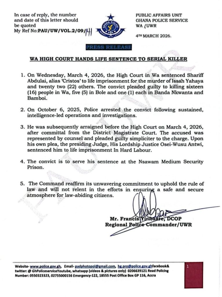 According to a press release issued by the Public Affairs Unit of the Ghana Police Service in Wa, the convict admitted responsibility for sixteen murders in Wa, five in Bole, and one each in Banda Nkwanta and Bamboi.